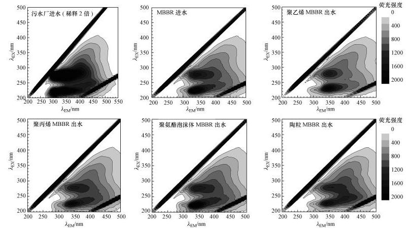 MBBR進(jìn)水和不同填料下MBBR出水中均含有SMP,但各填料MBBR出水中的I280/350值均小于進(jìn)水,排序為:MBBR進(jìn)水(1764)>聚氨酯泡沫體MBBR出水(1560)>聚乙烯MBBR出水(1498)>聚丙烯MBBR出水(1460)>陶粒MBBR出水(1414),表明部分SMP可以被MBBR內(nèi)微生物降解利用(Barker et al., 1999),MBBR反硝化脫氮時對尾水中的SMP也能進(jìn)一步去除,且陶粒和聚丙烯MBBR的去除效能更好.
