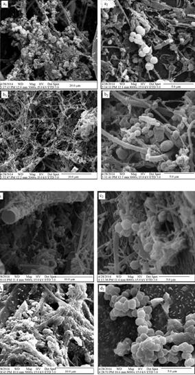 SEM觀察:穩(wěn)定階段取適量掛膜填料,從填料上剪下約5 mm×5 mm的帶有生物膜的小塊,經(jīng)過戊二醛固定、磷酸緩沖液清洗、乙醇梯度脫水等預(yù)處理后進(jìn)行臨界點干燥和離子濺射金(謝家儀等,2005),最后進(jìn)行掃描電鏡觀察.
