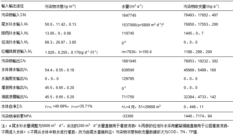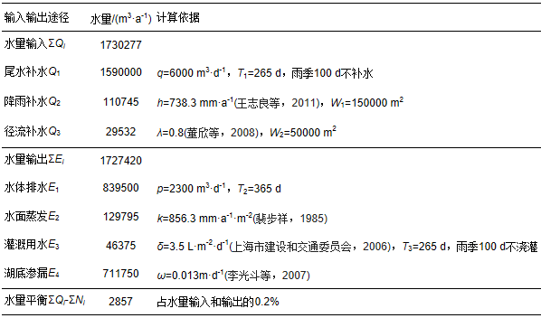 如前所述,污染物的輸入和輸出主要是通過水量的輸入和輸出來實(shí)現(xiàn)的,且輸入總量和輸出總量應(yīng)該滿足水量平衡關(guān)系,因此,首先需要利用式(3)和式(4)進(jìn)行輸入和輸出總水量的分析和計(jì)算.表 1為計(jì)算依據(jù)和計(jì)算結(jié)果,可以看出,在水量輸入中,尾水補(bǔ)水是翠湖水量輸入的主要途徑,占輸入總量的92%,徑流補(bǔ)水對水量輸入的貢獻(xiàn)率最小,僅為1.7%;在水量輸出中,水體排水和湖底滲漏是水量輸出的主要途徑,分別占輸出總水量的49%和41%,灌溉用水比例較小,僅占3%.另一方面,從水量平衡的結(jié)果看,輸入總水量和輸出總水量的差值為2857 m3 · a-1,僅相當(dāng)于輸入和輸出總水量的0.2%,滿足了式(2)的平衡關(guān)系,也就是說,在全年時(shí)間范圍內(nèi),水量的輸入總量與輸出總量基本接近,這與翠湖水體庫容和水位多年保持不變的實(shí)際情況相符.同時(shí)也表明,水量計(jì)算中各變量的取值都是合理的,這為污染物的輸入和輸出總量的分析和計(jì)算奠定了基礎(chǔ).