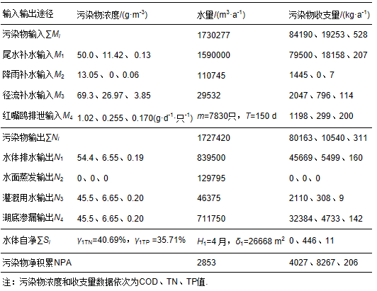 式中,c1為尾水中污染物濃度(g · m-3),c2為降雨中污染物濃度(g · m-3),c3為降雨徑流中污染物濃度(g · m-3),c為紅嘴鷗排泄物中相關(guān)污染物的含量(g · d-1 · 只-1),m為紅嘴鷗數(shù)量(只),t為每年紅嘴鷗的滯留時(shí)長(d).