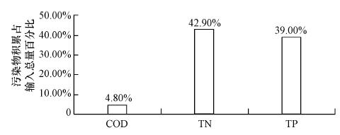 從表 2中污染物凈積累(NPA)的計(jì)算結(jié)果可以看出,COD在水體內(nèi)的積累程度不嚴(yán)重,積累量為4027 kg · a-1,僅占COD輸入總量的4.8%;TN在水體內(nèi)的積累程度最嚴(yán)重,積累量為8267 kg · a-1,占TN輸入總量的42.9%,與輸出總量基本相當(dāng);TP在水體內(nèi)的積累程度也很嚴(yán)重,積累量為206 kg · a-1,占TP輸入總量的39.0%(圖 3).NPA的計(jì)算結(jié)果表明,翠湖水體中TN和TP的積累程度很高,這為水體中營養(yǎng)物的富集和藻類的過度繁殖提供了條件,對水體富營養(yǎng)化的控制非常不利.