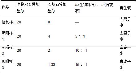 將生物沸石與石灰石的混合物(組成見表 1)裝入網兜,放入裝有100 mL氨氮質量濃度為250 mg · L-1的氯化銨溶液(TP濃度為0.5 mg · L-1)的250 mL燒杯中.在恒溫振蕩培養箱中吸附30 min,溫度為25 ℃,轉速為100 r · min-1.吸附結束后,將網兜取出快速放入50 mL去離子水中輕晃以去除生物沸石表面的氨氮.取出的網兜放入100 mL再生液(表 1)中,曝氣24 h后取樣分析,隨后換入100 mL再生液,每天更換再生液1次并連續曝氣24 h.