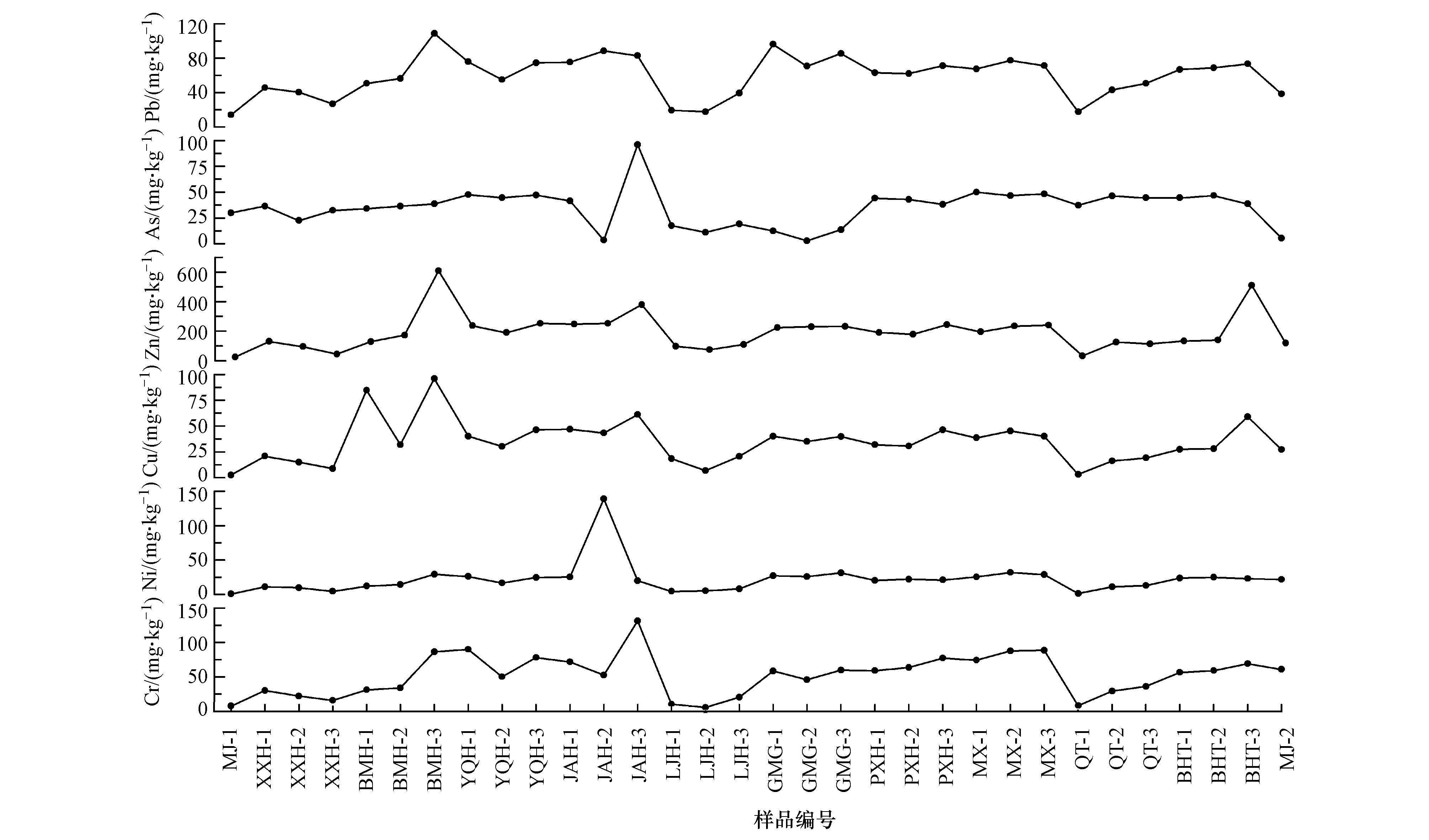 樣品經自然風干后,去除雜質,用瑪瑙研缽研磨至200目;準確稱取樣品0.0400 g于高壓消解罐的Teflon容器中,加入電子級混合酸(HF ∶ HNO3=3 ∶ 1)2 mL,置于烘箱內150 ℃加熱12 h;待樣品冷卻后加入0.25 mL HClO4,于150 ℃電熱板上蒸至近干,加入2 mL高純水和1 mL HNO3,放入烘箱內150 ℃回溶12 h;消解好的樣品用高純水定容至10 mL待測.重金屬元素采用美國Thermo Fisher公司X-SerieⅡ型ICP-MS質譜儀進行測試,以Rh和Re為內標對實驗過程進行監控,平行測試RSD<5%,實驗用水均為18.2 MΩ的高純水.為了保證實驗方法的可靠性,同時測定國家標準土壤參比物質(GSS-1)和平行樣進行質量控制.所有實驗數據均采用SPSS 20.0軟件進行正態分布檢驗和統計分析.