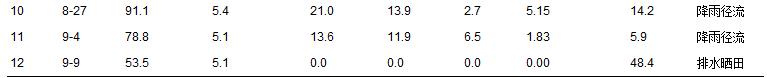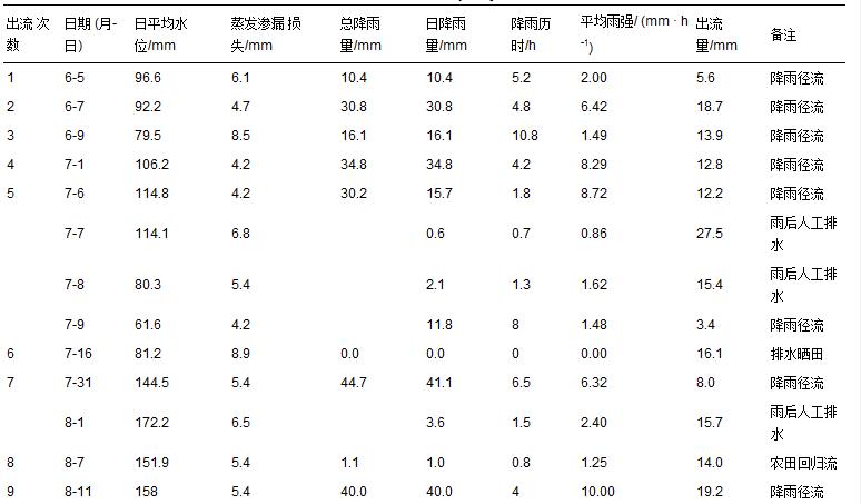 根據(jù)公式(1)和(2)計算得到水稻田在整個生長期的出流情況(表 1).其中,7月16日和9月9日2 d的出流分別發(fā)生在水稻分蘗期末期和成熟期,均由排水曬田造成,第二次的排水量最大,排水深度接近50 mm;8月7日降雨量僅1.1 mm,但產(chǎn)生了14 mm的出流,水位曲線上當日水位呈現(xiàn)先上升后下降的趨勢,且上升幅度遠高于1 mm,由此可推斷當日進行了人工灌溉,由于灌溉過量導致上游田塊水進入試驗田,使得田面水高度達到最低田埂高度,產(chǎn)生了出流.