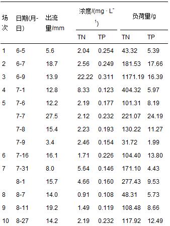 傳統(tǒng)觀測方法均需保證水稻田出水口唯一,徑流池觀測法需要建造徑流池,同步觀測法需要安裝觀測水量和水質的自動監(jiān)測裝置,且在降雨時進行同步觀測.若場次降雨量過大,部分田面水可能從田埂流出,沒有流入徑流池或集水裝置,使得計算結果偏低,特別是對于野外水稻田,可能存在多個出水口,無法采取傳統(tǒng)方法進行觀測.本試驗所采取的的觀測方法不需要保證單一的進水口和出水口,主要通過水位變化判斷是否產(chǎn)生徑流,并根據(jù)水量平衡原理估算徑流量,因此,對于野外試驗田,具有更強的適用性.另外,試驗需要的監(jiān)測儀器只有水位計和雨量計,不需要在試驗站點安排人員每日監(jiān)測,水質數(shù)據(jù)的測定采取定期采樣的方式,無需每次降雨后立即去現(xiàn)場采集田面水水樣,這使得本方法應用起來有較方便.