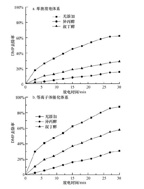 8)加入羥基自由基清除劑可大大降低DMP的去除效果,且等離子體催化體系中DMP的去除率要比等離子體單獨放電體系中高.