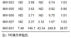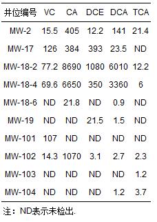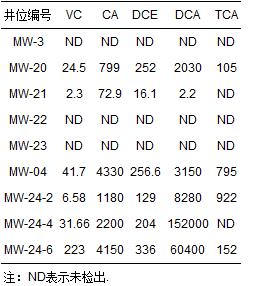 3號區(qū)域污染狀況介于1號和2號場地之間,各井位中5種氯代烴的濃度見表 3.MW-24-2監(jiān)測井為污染物濃度的最高點.與1號區(qū)域類似,多深度關(guān)聯(lián)井MW-24-2、MW-24-4、MW-24-6顯示出濃度依次下降的趨勢,反映了污染物在淺層地層的積累現(xiàn)狀.
