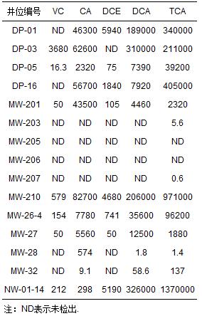 2號區(qū)域污染情況最為嚴重,各井位中5種氯代烴的濃度見表 2.MW-210、DP-01、DP-03及DP-16四口監(jiān)測井中氯代烴總量均接近甚至超過1000 mg·L-1水平,MW-210更是整個污染場地中污染物濃度最高的井位.MW-05監(jiān)測井中氯代烴濃度與該區(qū)域其他監(jiān)測井數(shù)據(jù)相比差異較大,表現(xiàn)出獨特的低濃度特性,可能是處于地下水水位較高區(qū)域,污染物遷出量較大造成的.