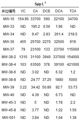 5號區(qū)域污染狀況僅次于2號區(qū)域,污染物濃度最大值出現(xiàn)在MW-38-6和MW-38-8兩口監(jiān)測井中,是該區(qū)域的污染源.各井位中5種氯代烴的濃度見表 5.其他井位中,MW-10、MW-37、MW-38-2和MW-38-4中污染物濃度均在100 mg·L-1附近.MW-34、MW-36、MW-45-3、MW-601監(jiān)測井中氯代烴總量在1 mg·L-1以下.