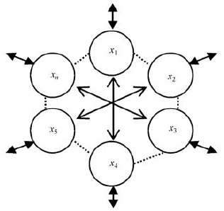 目前,熵理論在承載力評價(jià)方面主要用于熵權(quán)的獲得,避免了人為主觀性,評價(jià)準(zhǔn)確、直觀、方便(趙軍凱等,2009;孫京姐等,2010),但還沒有形成對生態(tài)承載力發(fā)展演化的動態(tài)描述.對于區(qū)域生態(tài)系統(tǒng)這樣的有機(jī)復(fù)雜整體,其內(nèi)在與外界及內(nèi)在相互的物質(zhì)能量流動構(gòu)成了動態(tài)的信息流動圖像,這種“流”載于結(jié)點(diǎn)之間的連接上,經(jīng)濟(jì)、社會和自然環(huán)境可以看作該系統(tǒng)的結(jié)點(diǎn),它們之間復(fù)雜的相互作用決定了其生態(tài)承載力狀況.作為一個(gè)典型的復(fù)雜系統(tǒng),其遵循最大信息熵原理(MIEP),即在給定約束下使廣義信息熵最大的分布是最可能出現(xiàn)的分布,一個(gè)遠(yuǎn)離平衡態(tài)的復(fù)雜開放系統(tǒng)總是尋找一種優(yōu)化過程使得系統(tǒng)在給定的約束下從外界獲得最大的廣義信息熵(Jaynes,1957;Chai et al.,2002).MIEP模型在各復(fù)雜系統(tǒng)的成功應(yīng)用為下文描述生態(tài)承載力奠定了基礎(chǔ)(韋海英等,2007;Du et al.,2014).因此,結(jié)合生態(tài)承載力的內(nèi)涵,可構(gòu)建一個(gè)以評價(jià)指標(biāo)為結(jié)點(diǎn)(xi)的信息網(wǎng)絡(luò)結(jié)構(gòu)(圖 1),該網(wǎng)絡(luò)各節(jié)點(diǎn)之間及節(jié)點(diǎn)和外部環(huán)境之間不斷進(jìn)行相互作用,這種相互作用可以描述為組元x1,x2,…,xn的耦合關(guān)系,x1~xn間所有可能的耦合關(guān)聯(lián)“信息”的匯合即為廣義信息流或廣義信息熵,設(shè)向量x=(x1,x2,…,xn),類比于經(jīng)典信息熵(Haken,2006),系統(tǒng)在t時(shí)刻的廣義信息熵SJ為: