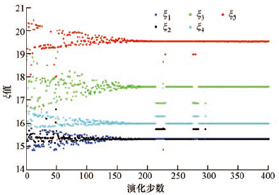 將指標(biāo)層的數(shù)據(jù)標(biāo)準(zhǔn)化,采用3×4網(wǎng)格數(shù)進(jìn)行400步演化模擬,計(jì)算洞庭湖生態(tài)經(jīng)濟(jì)區(qū)2008—2012年的ξ值(ξ1~ξ5),結(jié)果如圖 2所示.在演化過程中,指標(biāo)組元相互關(guān)聯(lián)、耦合,不斷進(jìn)行競爭和自組織作用,從而產(chǎn)生反映其生態(tài)承載力水平的獲勝模式,獲得了每一組給定x1,x2,…,xn數(shù)據(jù)下的ξ值.可以看出,前150步模擬ξ值波動較大,之后逐漸趨于穩(wěn)定,達(dá)到相對穩(wěn)定的模式結(jié)構(gòu),此時(shí)的ξ值可代表生態(tài)承載力水平.