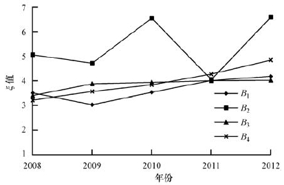 洞庭湖生態(tài)經(jīng)濟(jì)區(qū)生態(tài)彈性(B1)的發(fā)展?fàn)顟B(tài)分兩個(gè)階段:2008—2009年呈現(xiàn)下降趨勢,2009—2012年呈穩(wěn)步上升趨勢.可見前期對生態(tài)系統(tǒng)的利用和改造忽略了生態(tài)彈性方面的發(fā)展,導(dǎo)致生態(tài)系