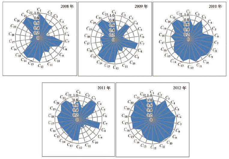 整體來看,從2008年至2012年,雷達(dá)圖覆蓋的面積越來越增大,說明洞庭湖生態(tài)經(jīng)濟(jì)區(qū)生態(tài)承載力發(fā)展過程的信息交流越來越強(qiáng)烈,系統(tǒng)結(jié)構(gòu)逐漸完善.2008年到2009年覆蓋面積相似,說明這兩年間各指標(biāo)的結(jié)構(gòu)狀態(tài)沒有發(fā)生較大變化.相比于前兩年,2010年到2012年萬元GDP能耗(C16)、農(nóng)藥施用強(qiáng)度(C17)、環(huán)保支出占財(cái)政比重(C18)和人均國內(nèi)生產(chǎn)總值(C19)的較大發(fā)展使其對生態(tài)承載力的貢獻(xiàn)變大,指標(biāo)均衡度提高,促進(jìn)生態(tài)承載力發(fā)展結(jié)構(gòu)的完善.2010年和2012年洞庭湖生態(tài)經(jīng)濟(jì)區(qū)的地表水資源量(C9)、地下水資源量(C10)和人均水資源量(C11)三方面指標(biāo)的較高水平使該地區(qū)生態(tài)承載力的系統(tǒng)結(jié)構(gòu)有了明顯的改善,各指標(biāo)發(fā)展更均衡,生態(tài)承載力水平大幅提高.這與當(dāng)?shù)氐膶?shí)際情況相符,2010年和2012年洞庭湖生態(tài)經(jīng)濟(jì)區(qū)年人均水資源總量分別為2430.914 m3和2480.617 m3,遠(yuǎn)高于其他年份,促使這兩年洞庭湖生態(tài)經(jīng)濟(jì)區(qū)的生態(tài)承載力達(dá)到兩個(gè)較協(xié)調(diào)穩(wěn)定的發(fā)展?fàn)顟B(tài),從而造成2011年生態(tài)承載力水平異常發(fā)展的現(xiàn)象.
