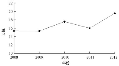 將模擬得到的表征生態(tài)承載力水平的每一組給定x1,x2,…,xn數(shù)據(jù)下的ξ值整理后作折線圖,從圖 3以看出,洞庭湖生態(tài)經(jīng)濟(jì)區(qū)2008—2012年期間生態(tài)承載力呈總體上升的趨勢,其中,2008年和2009年兩年生態(tài)承載力水平基本一致,2009—2010年呈現(xiàn)較明顯的上升,而2010—2011年呈現(xiàn)下降趨勢,2011—2012年生態(tài)承載力水平大幅度提高.說明近年來對洞庭湖生態(tài)經(jīng)濟(jì)區(qū)的生態(tài)承載力建設(shè)效果顯著,該區(qū)域生態(tài)系統(tǒng)組元間的耦合關(guān)系越來越緊密.但2011年生態(tài)承載力水平的異常情況需要進(jìn)一步模擬分析,從而為該地區(qū)下一步的規(guī)劃建設(shè)提出針對性的建議.