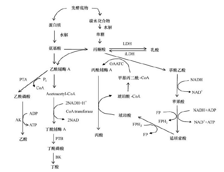 在發酵過程中,通過設定不同C/N比條件,測定不同C/N比下關鍵酶的酶活和產酸量,則三者可以建立函數關系.短鏈脂肪酸的生成途徑如圖 2所示(Feng et al., 2009),乙酸生成的關鍵酶分別為乙酸激酶(AK)和磷酸轉移乙酰酶(PTA),丁酸合成的關鍵酶有丁酸激酶(BK)和磷酸轉移丁酰酶(PTB);丙酮酸轉化為乙酸過程中,關鍵酶為甲基丙二酰CoA變位酶(MCM).由于底物C/N比的改變會導致產酸微生物體內的酶活性改變,從而改變微生物不同代謝途徑的代謝通量,并最終導致各種短鏈脂肪酸的生成受到影響,由此產生了不同的產酸類型.因此,C/N比是自變量,而關鍵酶活性和產酸類型是因變量.