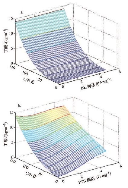 圖 5 C/N比、丁酸關鍵酶活和不同酸產量之間的曲面模型(a.丁酸激酶(BK),b.磷酸轉乙酰酶(PTB)