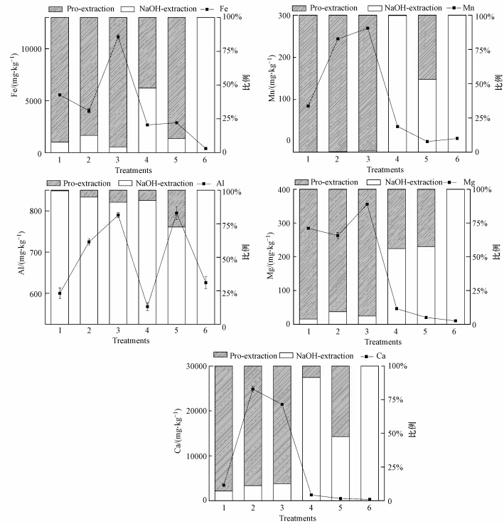 圖 2 不同提取液中Fe、Mn、Al、Mg、Ca離子濃度變化