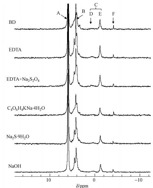 沉積物有機(jī)磷提取的最優(yōu)效果是獲得較理想的有機(jī)磷提取量和低濃度的順磁性離子(Fe(Ⅲ)、Mn(Ⅱ)、Co(Ⅱ)、Ni(Ⅱ)),這些順磁性離子的存在會(huì)提高弛豫時(shí)間,增加譜圖的線寬使峰形重疊(Ding et al., 2010).不同提取劑Fe、Mn等5種離子的提取情況見(jiàn)圖 2.就Fe離子而言,EDTA+Na2S2O4前處理對(duì)Fe離子的去除效率最高,提取液中Fe離子濃度為(106677.21±215.82)mg · kg-1.5種前處理中EDTA和EDTA+Na2S2O4前提取液中Mn離子濃度高于其它3個(gè)處理,分別為(243.02±2.80)和(266.61±1.84)mg · kg-1.Na2S · 9H2O前提取液中Al離子濃度最高為(217.65±7.12)mg · kg-1.5種提取劑前提取后NaOH溶液提取液中Al離子的濃度EDTA+Na2S2O和EDTA處理較高為(718.95±5.25)和(687.73±3.53)mg · kg-1,其余3個(gè)處理NaOH提取液中Al離子濃度均低于前兩個(gè)處理.EDTA和EDTA+Na2S2O4兩處理前提取液中Ca離子濃度較高,分別為(22062.99±486.93)和(18729.74±26.93)mg · kg-1.BD、EDTA和EDTA+Na2S2O4前提取液中Mg離子濃度較高,分別為(273.06±1.24)、(238.32±8.37)和(333.68±0.36)mg · kg-1,其余兩處理前提取液中Mg離子濃度較低.