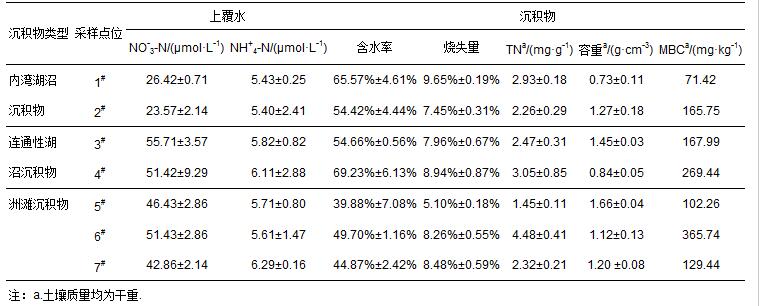 采樣點位上覆水及沉積物的理化性質如表 1所示,洲灘沉積物上覆水中的NO-3-N濃度在42.86 ~51.43 μmol · L-1之間,其平均值(47.14 μmol · L-1)大于湖沼沉積物上覆水的NO-3-N(39.29 μmol · L-1),但湖沼沉積物上覆水NO-3-N的濃度范圍更廣(23.57~55.71 μmol · L-1),而且內灣區的NO-3-N濃度顯著低于連通區(p<0.01).洲灘與湖沼沉積物上覆水NH+4-N平均濃度的差異不顯著,但具有顯著水力聯系差異的內灣區湖沼沉積物NH+4-N顯著低于連通區湖沼沉積物,且達到水平(p=0.05).
