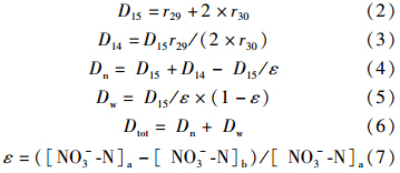 通過生成的29N2、30N2,計算利用15NO-3-N而發生的反硝化速率D15(Rysgaard et al., 1993),利用未標記的14NO-3-N產生的反硝化速率D14,通過以上結果計算Dn、Dw,具體公式如下: