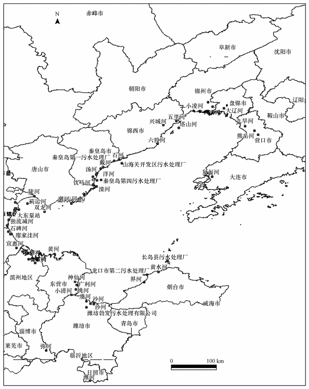 研究區域渤海是1個半封閉的陸架邊緣海,三面環陸,位于遼寧、河北、山東、天津3省1市之間.具體位置在北緯37°07′~41°00′、東經117°35′~121°10′.渤海主要由遼東灣、渤海灣、萊州灣及中央海區組成,面積為7.7×104 km2,平均水深約18 m,最大水深85 m,海域面積約7.7萬 km2.渤海入海河流大約有45條,分布在海河、黃河、遼河三大流域7個水系.
