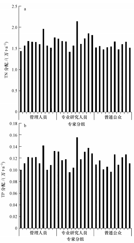 圖 4是根據不同專家權重系數計算出對應的污染源負荷分配總量分布情況.圖 4中,根據30名專家權重值計算的TN分配量平均值為1.64萬t · a-1,標準差為0.16萬t · a-1,變差系數為9%;最大值和最小值相對平均值偏離比例分別為31%和-13%.TP分配量的平均值為0.12萬t · a-1,標準差為0.014萬t · a-1,變差系數為12%;最大值和最小值相對平均值偏離比例分別為32%和-19%.說明不同專家權重方案給負荷總量分配結果帶來一定的影響,雖然TN和TP整體上偏離值為9%和12%,但個別較為極端的權重系數取值導致分配負荷量偏離比例比較大.