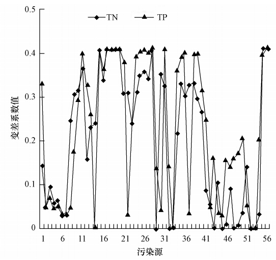 進一步分析專家決策對56個污染源負荷分配的影響.圖 6為56個污染源的污染負荷分配變差系數分布.圖 6中,56個污染源TN和TP的變差系數的變化具有一定的相似性,TN和TP變差系數平均值分別為0.20和0.22,最大值均為0.41.