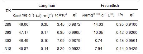 式(5)中,qmax(mg · g-1)為Langmuir吸附等溫線的飽和吸附容量;b為Langmuir常數(shù).公式(6)中,kf和n均為Freundlich常數(shù).