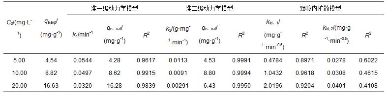 準(zhǔn)一級和準(zhǔn)二級和顆粒內(nèi)擴(kuò)散動力學(xué)模型分別可用公式(2)~(4)表示(Bhatnagar et al., 2009):