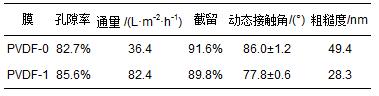 純PVDF膜和Ag/PVDF雜化膜動態(tài)接觸角測試結(jié)果如表 1所示.由于納米Ag粒子的添加,膜動態(tài)接觸角由(86.0±1.2)°下降為(77.8±0.6)°.說明雜化膜與純PVDF膜相比,親水性有了顯著地提高,該結(jié)果也與膜純水通量的結(jié)果相一致.
