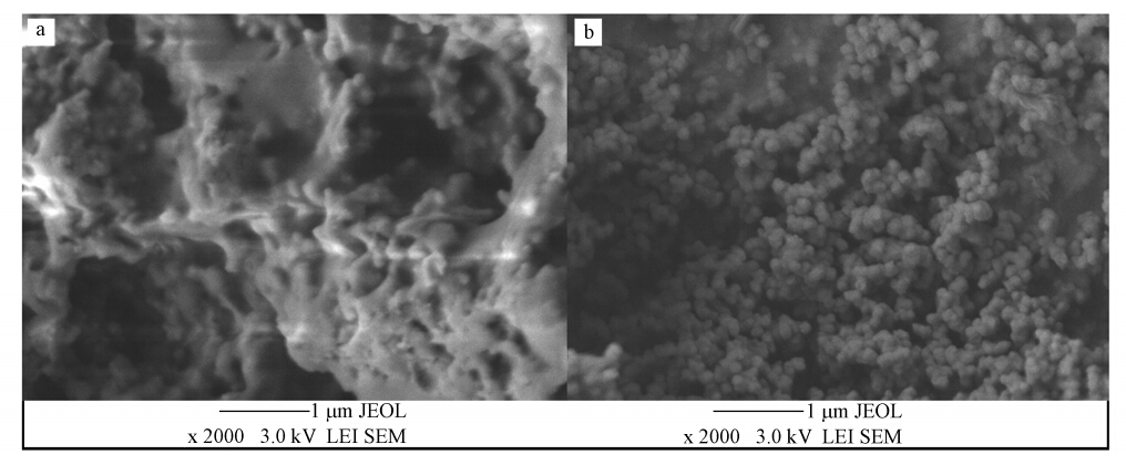 圖 1 試樣的SEM圖(a: GTE-Fe NPs; b: CTAB作用下合成的GTE-Fe NPs)