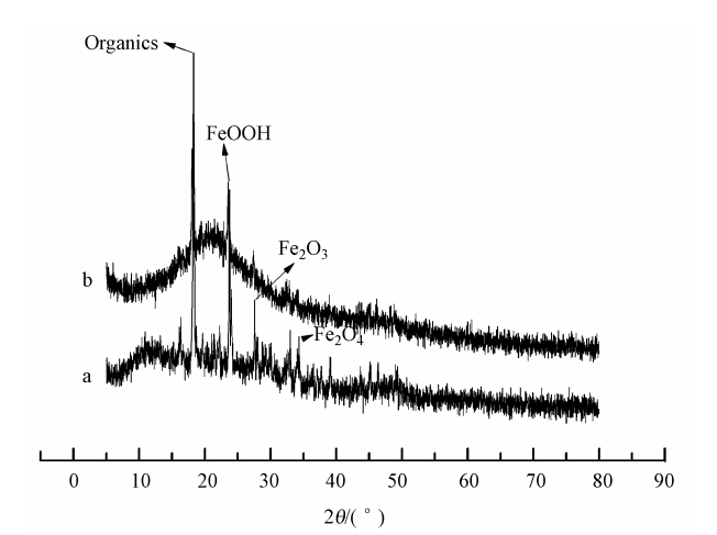 圖 2 試樣的XRD圖(a.GTE-Fe NPs; b. CTAB作用下合成的GTE-Fe NPs)