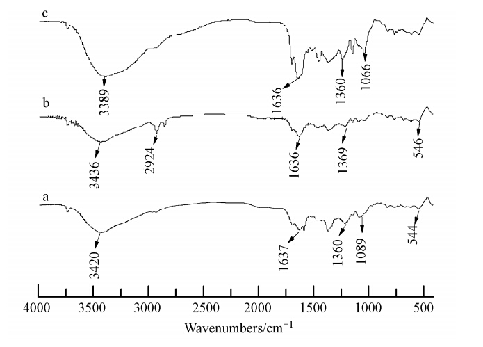 圖 3 試樣的FTIR圖(a.GTE-Fe NPs;b.CTAB作用下合成的GTE-Fe NPs; c.GTE)