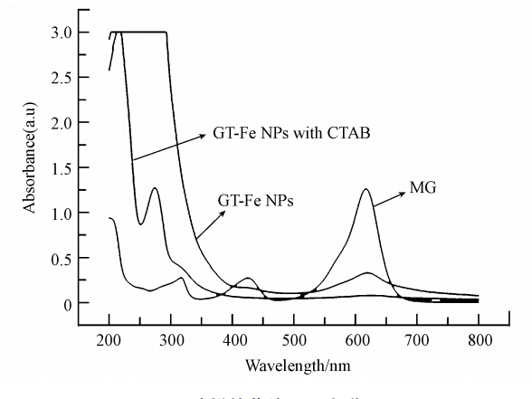 降解反應在離心管中進行,反應溫度為298 K,分別移取2 mL GTE合成的Fe NPs懸濁液和CTAB作用下合成的Fe NPs懸濁液至7支離心管中,分別向每個離心管中移入8 mL(50 mg · L-1)的MG溶液,在搖床中分別振蕩0、10、20、30、40、50、60 min取樣,反應液在10000 r · min-1下離心5 min,上清液用紫外可見分光光度計于617 nm處測定溶液吸光度,用MG的去除率來評價和比較GTE合成的Fe NPs和CTAB作用下GTE合成的Fe NPs的性能.