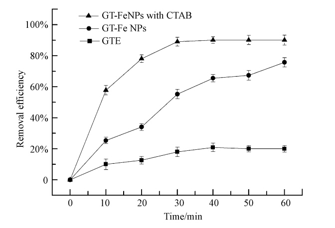 2)比較GTE、GTE合成的Fe NPs和CTAB作用下GTE合成的Fe NPs對MG的去除效果發現,GTE對MG有一定的去除作用,30 min達到平衡時,去除率為20.03%;GTE合成的Fe NPs對MG的去除效率30 min為52.28%,反應平衡時達到75.66%;而CTAB作用下GTE合成的Fe NPs對MG的去除效率更大,30 min就達到了77.78%,反應達到平衡高達91.06%. Fe NPs是去除MG的主要物質.