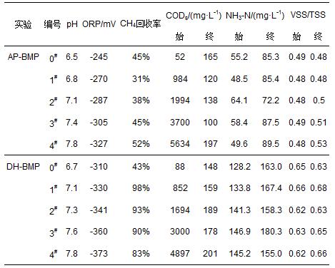 AP-BMP、DH-BMP兩個批次實驗結束時,不同S/X條件下的水質狀況如表 3所示.兩個批次實驗中隨著S/X增大,pH由弱酸性漸變為弱堿性,分別位于在6.5~7.8、6.7~7.8范圍內.0#呈弱酸性,可能由未添加基質、厭氧污泥自身的水解造成.DH-BMP與AP-BMP實驗結束時,ORP值分別位于-245~-327 mV與-310~-373 mV范圍內.隨著S/X比的增大,兩個批次實驗的ORP值都呈下降的趨勢.厭氧環境的主要標志是發酵液具有低的ORP,不同的厭氧消化體系和不同的厭氧微生物對ORP的要求不同.通常中溫厭氧消化系統要求的ORP應位于-300~-380 mV之間,產CH4菌最適宜的ORP為-350 mV或更低.DH-BMP實驗樣品的ORP明顯低于對應的AP-BMP實驗樣品值,表明DH-BMP中形成了良好的厭氧生化條件,厭氧污泥的活性高.