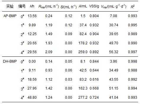 應用改進的Gompertz模型對AP-BMP、DH-BMP產氣進行回歸后的參數如表 2所示.兩廠的厭氧污泥產氣數據與改進的Gompertz模型擬合較好(R2>0.99).通常厭氧消化過程中的限速步驟為水解破壁過程(Noike et al., 1985),在無添加外來基質的0#樣品中,AP、DH厭氧污泥的遲滯期分別為13.56、0 h,表明DH厭氧污泥的活性較高.投加基質NaAc對厭氧污泥具有一定的抑制作用,且抑制作用隨基質濃度的提高而提升.DH厭氧污泥4#條件下遲滯期達到48.80 h,可能與4#樣品中S/X最高(0.67)有關.Prashanth等(2006)指出,較高的S/X比造成的氨氮和揮發酸的積累,對厭氧菌群產生一定的抑制作用,通常較低S/X值下的遲滯期較短(Chen et al., 1996).而在AP-BMP實驗中,無添加基質的0#的遲滯期達到了13.56 h,高于添加添加基質的1#、2#.這可能是由于AP厭氧污泥的反應活性較差,在無基質添加條件下需調整造成的.