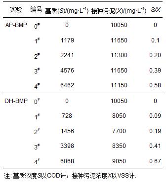 AP-BMP、DH-BMP共設置5組不同的食微比S/X(0、0.1、0.2、0.4、0.6)進行BMP實驗,實測S/X如表 1所示.依據測試基質濃度在120 mL的血清瓶中加入定量儲備NaAc溶液,基質體積為60 mL.厭氧微量元素溶液采用提出的配方,其中,CaCl2 · 2H2O、NH4Cl、MgCl2 · 6H2O、KCl、MnCl2 · 4H2O、CoCl2 · 6H2O、H3BO3、CuCl2 · 2H2O、Na2MoO4 · 2H2O、ZnCl2的濃度分別為16.7、26.6、120、86.7、1.33、2、0.38、0.18、0.17、0.14 g · L-1.每個血清瓶加入27 mL的微量元素液體和5.4 mL的(NH4)2HPO4(26.7 g · L-1),之后接種同量的厭氧污泥后,蓋上膠蓋并用鋁箔封口.在35 ℃下旋轉培養箱內進行實驗,實驗過程中以玻璃注射筒(50 mL)測量總產氣量,并利用GC-ECD測定CH4、CO2和H2的比例.AP-BMP、DH-BMP分別設置兩組平行實驗,產氣量測量可精確到0.1 mL.