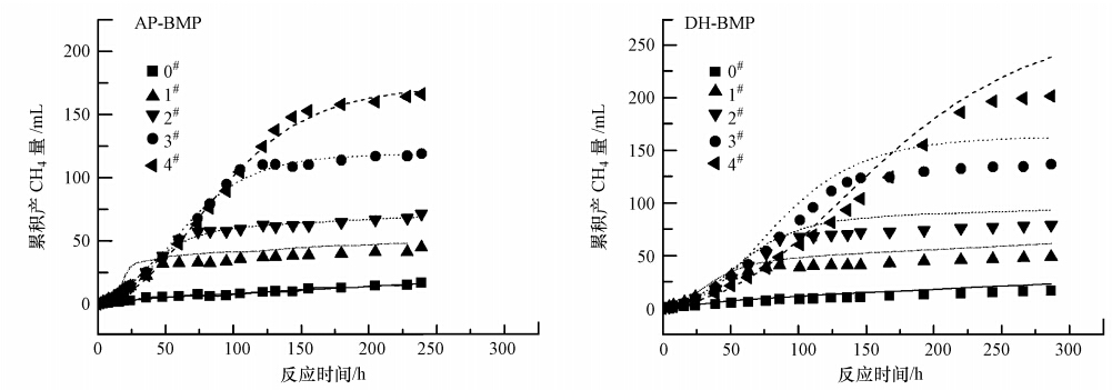 AP-BMP、DH-BMP批次實驗持續時間分別為239 h、286 h,由圖 1可知,5組不同投配比條件下的累積產氣量存在著明顯的差異.實驗初期,累積產氣量差異不明顯,后期逐步增大.氣體成分以CH4(80%)、CO2(20%)為主,同時存在少量的H2(不足1%).以NaAc為基質的實驗,由于不經歷酸化水解的限速階段,產氣速度較快,但高濃度的NaAc對厭氧污泥也存在著一定的抑制作用,例如,DH-BMP實驗中,S/X值最高的4#樣品產CH4量在170 h后才超過3#樣品.AP-BMP實驗中,4#樣品的產CH4量最高,達到了166 mL,DH-BMP中最高的產CH4量達到了201 mL.