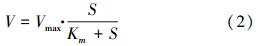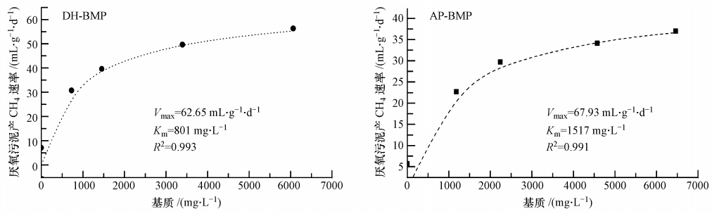 式中,Vmax為最大比產氣速率(mL · g-1 · d-1,以VSS計),V為比產氣速率(mL · g-1 · d-1,以VSS計),Km為半飽和常數(mg · L-1,以COD計),S為基質濃度(mg · L-1,以COD計).