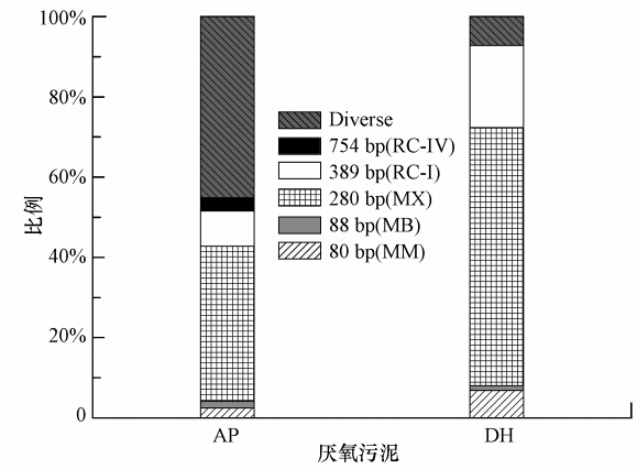 如圖 3所示,兩廠的厭氧污泥中產CH4菌的組成存在著一定的差異.AP廠厭氧消化池中的厭氧污泥Diverse菌群相對豐度達45%,產CH4功能菌主要以產CH4髦毛菌Methanosaeta spp.(280 bps)為主,同時存有少量的產CH4微菌Methanomicrobiaceae(80 bps)、RC-I(389 bps)和產CH4桿菌Methanobacteriaceae(88 bps).同時,DH厭氧消化池中的厭氧污泥產CH4功能菌相對豐度高,Diverse菌群相對豐度僅為7%.產CH4功能菌主要以產CH4髦毛菌Methanosaeta spp.(280 bps)為主,同時存在產CH4微菌Methanomicrobiaceae(80 bps)、RC-I(389 bps)和產CH4桿菌Methanobacteriacea(88 bps).DH污水廠的進水是由完整的市政下水道收集的生活污水,污水中有機含量高,可生化降解性能強,為厭氧消化提供了良好的條件,從而造成了DH厭氧消化池中厭氧污泥產CH4功能菌群豐度較高.