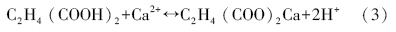 當溶液的pH值相同時,丁二酸濃度對CP結晶沉淀反應溶液中磷的最終去除率有一定影響,但不是很明顯.從圖 4 a中可以看出,當pH值為9.0時,溶液中丁二酸濃度從0 mmol · L-1增加到10 mmol · L-1,磷的去除率從95%下降到84%左右;當 pH值分別為8.0、8.5和9.5時,磷的去除率分別下降約17%、15%和9%.隨著pH值的升高,丁二酸對CP結晶反應中磷的最終去除率影響略有減小.這是由于丁二酸與Ca2+ 也可能按反應式(3)發生絡合,對CP反應產物生成量有一定的抑制作用;但這種絡合作用隨pH值升高而逐漸減小.圖 4b所示的是溶液pH值為9.0時不同丁二酸濃度對磷的去除速率和效率的影響.從圖中可以看出,除了隨丁二酸濃度升高導致磷的去除率有所降低外,溶液中不同濃度丁二酸對CP結晶沉淀速率影響不明顯,反應均能快速進行,基本在5 min內達到平衡.