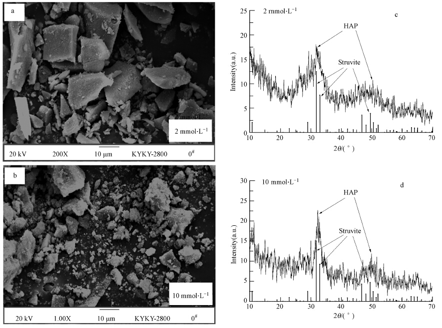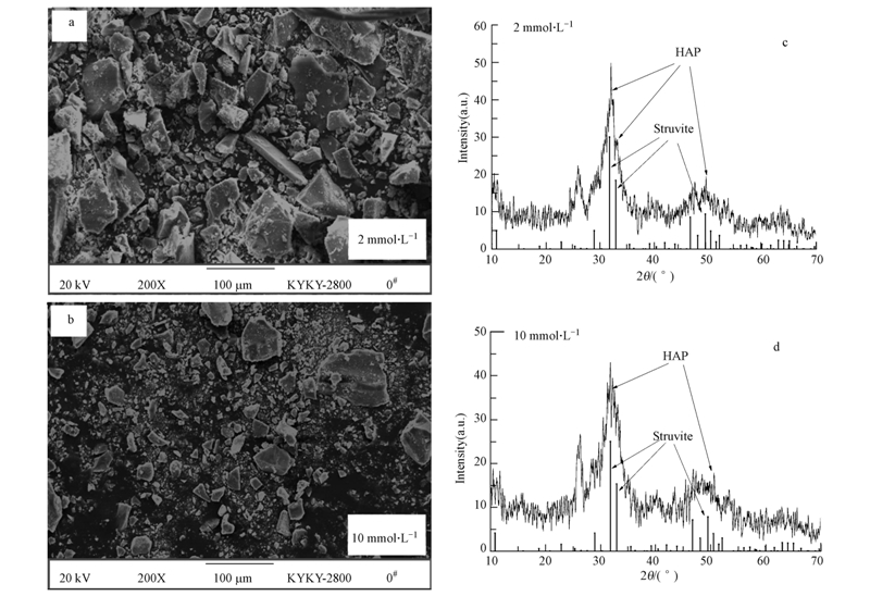 圖 7表示的是溶液pH值為9.0條件下,乙酸濃度分別為2和10 mmol · L-1時所得CP結晶沉淀反應產物SEM照片與XRD分析圖譜.從圖中可以看出,在不同乙酸濃度下得到的結晶產物形貌均呈 不規則塊狀(圖 7a、b),晶體產物的形狀沒有發生明顯變化,但晶粒大小有所不同.隨著溶液中乙酸濃度的增加,反應所得顆粒體積明顯變小,沉淀性能降低.從圖 7c、d可見,通過將X射線衍射圖譜的三強峰與標準峰對照,可以確定晶體結構為磷酸鈣(Ca5(PO4)3OH),結晶產物基本一致.乙酸對結晶產物的形狀及成分均沒有明顯影響,但會影響產物體積大小,進而影響其沉淀性能.具體參見污水寶商城資料或http://m.xhxdt.com更多相關技術文檔。