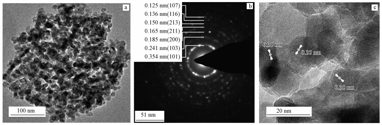 對催化活性最高的銳鈦礦型TiO2進行物理表征,圖 2所示為銳鈦礦型TiO2的電鏡分析結果.圖 2a表示的是100 nm級催化劑晶體的形態,由圖可知,晶體分散性良好,TiO2納米顆粒為單晶結構,顆粒的尺寸分布較均勻,約為10 nm. 圖 2b為TiO2晶體的電子衍射圖,衍射譜圖可以標定為銳鈦礦結構的TiO2,表明產物具有比較單一的銳鈦礦結構,并且銳鈦礦TiO2晶體結晶性良好. 圖 2c是晶體的高分辨透射電鏡圖,從圖上可以看到,晶體結晶為單晶顆粒,可觀察到清晰的晶格條紋,其面間距為0.35 nm,對應于銳鈦礦TiO2晶體的{101}晶面.