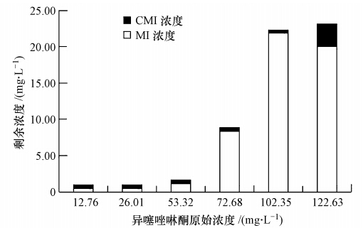 異噻唑啉酮模擬廢水由含無機鹽的工業純異噻唑啉酮溶液配制. 高濃度母液(14000 mg · L-1)稀釋后測得的異噻唑啉酮模擬廢水的水質為pH 4.0,無色透明,CMI濃度為94 mg · L-1,MI濃度為47 mg · L-1,兩者之和為異噻唑啉酮濃度(141 mg · L-1),即初始異噻唑啉酮濃度;溶液中含有較高濃度的NO-3(170.5 mg · L-1)和SO2-4(9.9 mg · L-1).