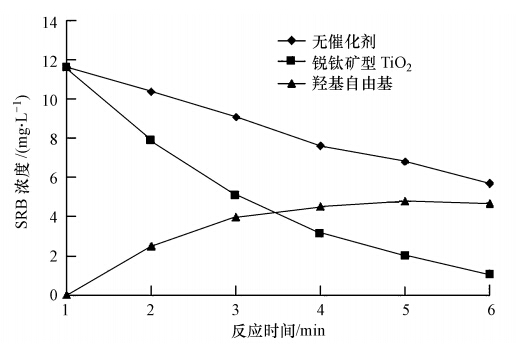 在半導體光催化反應中,存在自由基反應機理和直接氧化機理.根據自由基反應機理(間接反應機理),光生載流子先與催化劑表面吸附的氧、水分子等介質發生反應,生成的自由基才是直接參與反應的物質.為了確定合成的銳鈦礦型TiO2在溶液中產生自由基的情況,采用SRB降解的動力學曲線法進行測定.在500 W Xe燈模擬的自然光照條件下,分別對無催化劑和50 mL溶液投加5 mg銳鈦礦型TiO2催化劑條件下的SRB降解的動力學曲線進行分析,考察了產生自由基情況,結果見圖 7.