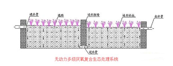 無動力多級厭氧復合生態處理系統工藝流程如下: