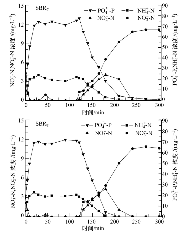 兩套SBR反應器穩定運行狀態下,出水乙酸鈉和亞硝酸鹽濃度低于檢測方法的檢出限,出水PO3-4-P,NH+4-N濃度均小于0.5 mg · L-1,反應器具有良好的脫氮除磷功能;SBRC反應器出水NO-3-N濃度為(12.9±2.2)mg · L-1,SBRT反應器出水NO-3-N濃度為(15.3±2.0)mg · L-1.表明TBBPA對SBR反應器硝化和除磷效率沒有太大影響,但對出水硝態氮濃度略有影響.