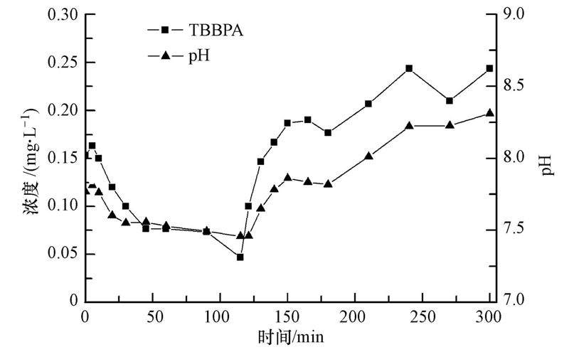 在對SBRT反應周期內TBBPA的濃度和pH進行相關性分析時,TBBPA的濃度跟pH有一定線性相關性,相關系數r為0.94.由圖 3所示,厭氧階段,由于強化生物除磷攝取有機物等反應,pH有所降低;TBBPA的濃度隨著pH的降低而下降,厭氧結束時TBBPA濃度達到最低0.05 mg · L-1.曝氣開始后,由于曝氣導致二氧化碳等吹脫,pH升高,TBBPA濃度隨著pH的升高而升高.TBBPA隨著pH變化的原因為TBBPA的溶解度受pH影響較大,當pH小于7.5時,TBBPA溶解度很低而主要被活性污泥吸附,而pH增加到8時,TBBPA的溶解度急劇上升,表現為溶液中TBBPA濃度的增加.