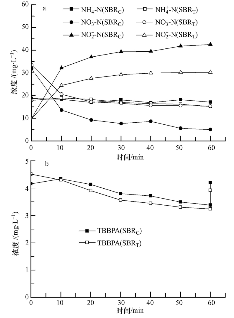 本研究采用實驗室序批式活性污泥反應器(sequencing batch reactor activated sludge process,SBR),研究TBBPA在工藝中的去除,尤其關注其在SBR典型周期內的變化特征,以及TBBPA在硝化反硝化過程中的去除特性和相關機理.
